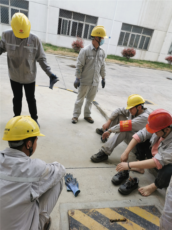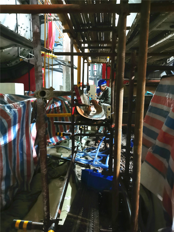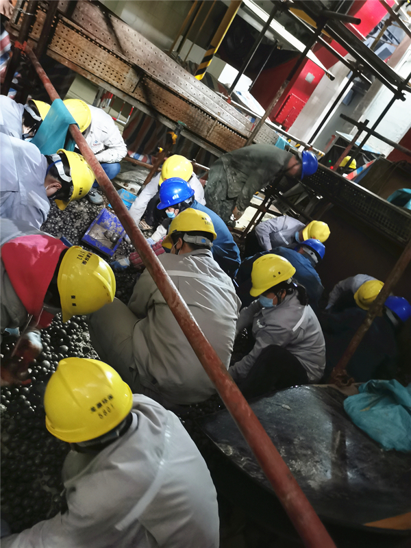 3月28日,在鋼球回裝環(huán)節(jié)需人工篩撿35噸直徑達(dá)標(biāo)的鋼球加入磨機(jī)系統(tǒng),此項(xiàng)工作量大繁瑣,分公司領(lǐng)導(dǎo)及時(shí)協(xié)調(diào)組織全員加入鋼球回裝工作。他們靈活使用身邊的螺絲刀、小撬棍將鋼球一個(gè)個(gè)從泥濘的漿液中挑選出來,收集在吊斗里再加入磨機(jī)滾筒中。工作中同志們的工作服被漿液浸濕也不怕臟;手指因長(zhǎng)時(shí)間佩戴防護(hù)手套在漿液中挑揀泡的發(fā)白也不叫苦;在鋼球池中一蹲就是數(shù)小時(shí)也不喊累。大家相互加油鼓勁共克時(shí)艱。29日晚,經(jīng)過兩天的全員行動(dòng)最終完成全部的鋼球回裝工作,30日,完成人孔門封堵及試運(yùn),31日,試運(yùn)合格此次檢修項(xiàng)目順利結(jié)束。