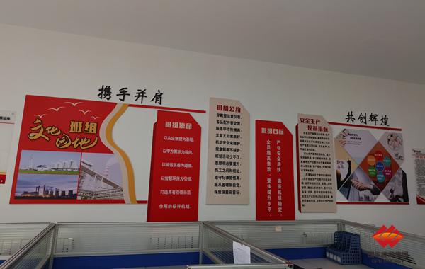 布連分公司結合龍源環保VI手冊,集思廣益、博采眾長,為生產區域及班組設計了布連分公司的文化墻。“亮劍精神、大事記、公司簡介、會議室背景墻、職工書屋、榮譽墻、班組園地”等主題突出,內容豐富。布連分公司還對生產區域、檢修班組、運行班組的基礎設施等進行了美化改造,改善了工作環境、豐富了文化內容,明確布連分公司各崗位人員工作職責和安全制度要求,為進一步提升“龍源運維”企業形象打下堅實的基礎。